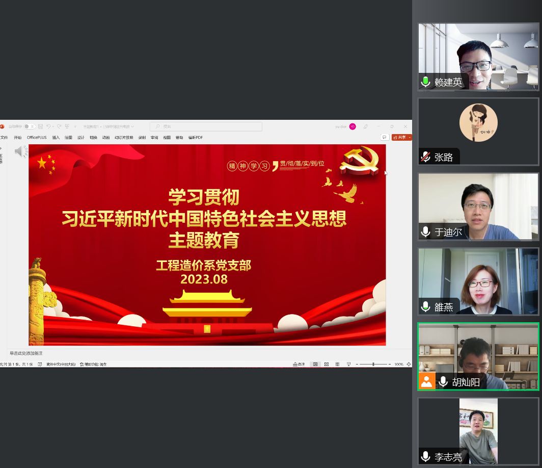 8月5日,伟德国际1946源于英国工程造价系支部在线上开展学习贯彻习近平新时代中国特色社会主义思想主题教育集中学习。会议由党支部书记胡灿阳同志主持,由支部党员教师于迪尔同志领学,支部全体党员参加。